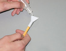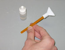 | Discard swab wrapping. (suggest blowing off with bulb blower to remove any fibers that may have shed in transport) | Apply cleaning liquid evenly across edge, taking precaution not to oversaturate the swab. | |